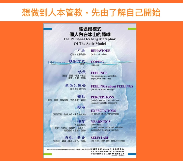 家庭治療師維琴尼亞・薩提爾Virginia Satir的冰山理論是一個簡單的工具去看清自己。我們需要認清自己才有機會轉化。自己被滋潤才能滋潤我們的小朋友。薩提爾提出我們能觀察的行為底下隱含著更多未曾透視的原素。她以冰山作為比喻,冰山露出水面的部分就是行為,而水面以下的就是當時人的感受、感受的感受、觀點、期待、渴望,和我是誰。